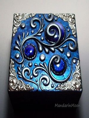 Coller le dessus de la boîte et rabattre le métal en surplus tout autour du couvercle. Découper une ou deux bandes d'une largeur et longueur suffisantes pour recouvrir la tranche du couvercle. Avec le stylet, dessiner une ligne de points sur chaque bord. Coller la ou les bandes.