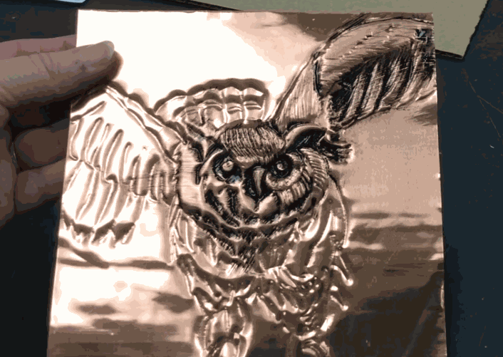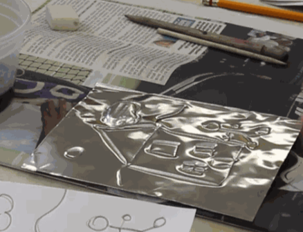 Vous pouvez tester la technique avec du métal récupéré d'une barquette en aluminium d'une lasagne, les couvercles de pots de yaourt et autres. Le stylet peut être remplacé par un crayon à papier qui tantôt sera usé, tantôt bien taillé mais pas trop pointu pour ne pas percer le métal.