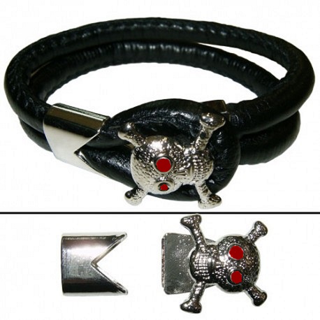 Fermoir boucle Tête de mort - 20 mm - Pour cordon 6 mm - Argenté avec strass rouge - 2 pièces