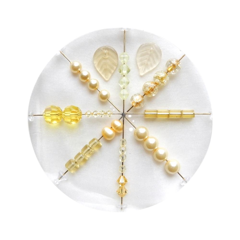 Assortiment de 40 perles tons jaunes pour boucles d'oreilles : 4 toupies Swarovski 4 mm, 2 toupies Swarovski 6 mm, 2 boules à facettes 10 mm, 4 rectangles fantaisie, 4 facettes 4 mm, 2 perles d'eau douce, 4 tubes 4 mm, 4 bicones 6 mm, 4 boules craquelées 8 mm, 2 feuilles, 4 boules nacrées 8 mm, 4 boules nacrées 6 mm.