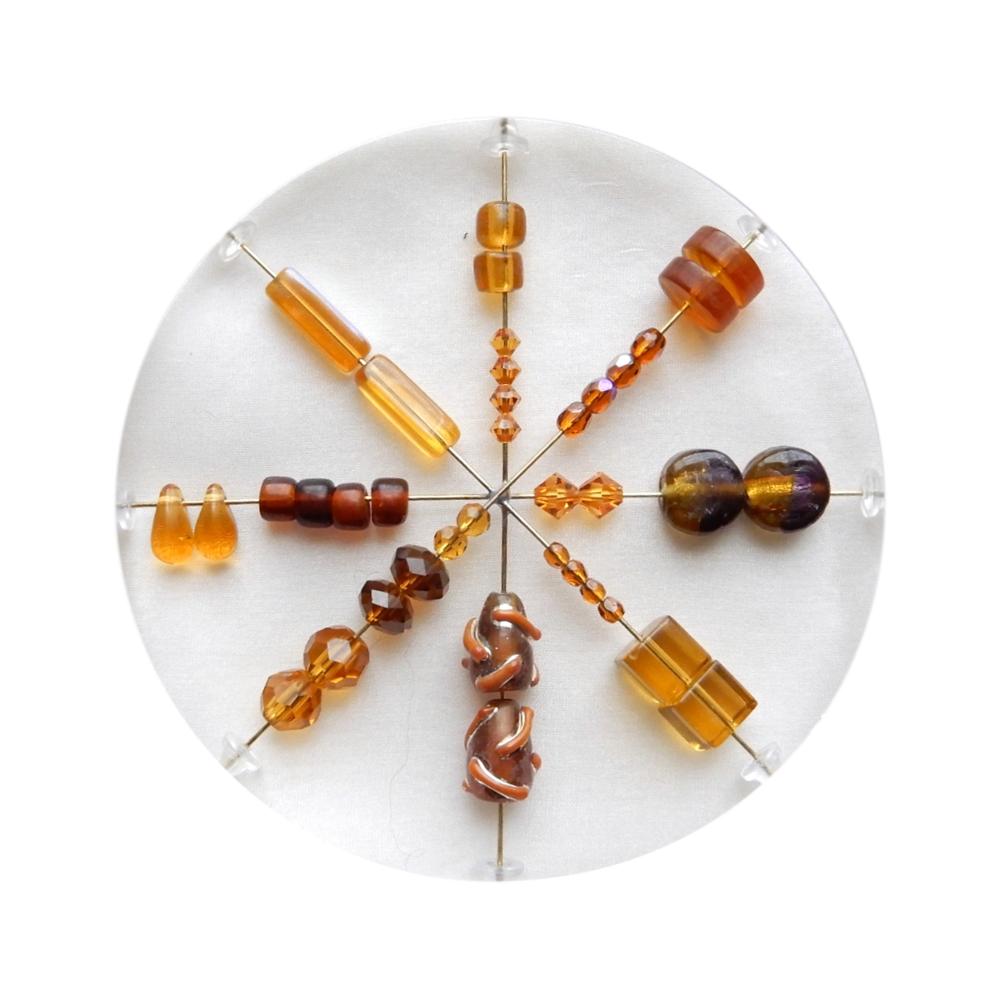 2 carrés plats bord bronze, 2 boules lignées 8 mm, 2 melons 8 mm, 2 melons 10 mm, 4 facettes 4 mm, 4 rondes à facettes 4 mm.