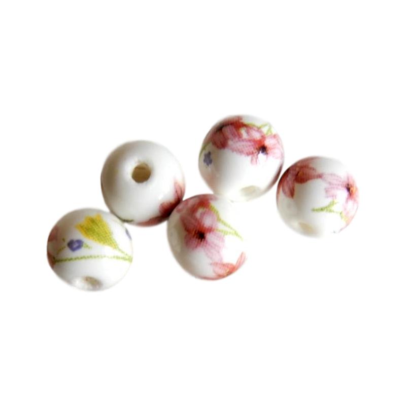 Perle en céramique - Boule - 8 mm - Imprimé fleurs vieux rose - 10 pièces