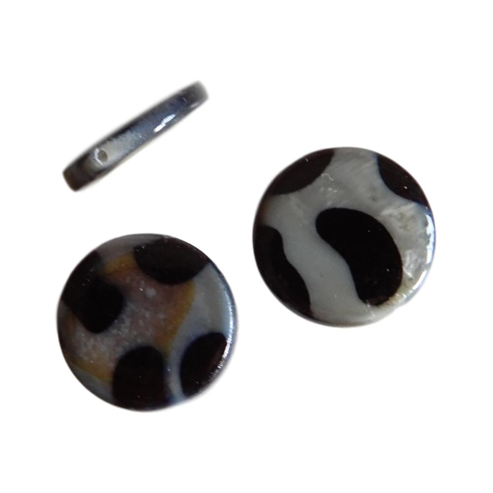Perle en nacre - Rond plat - 15 mm - Imprimé tâches noires sur fond gris - 10 pièces