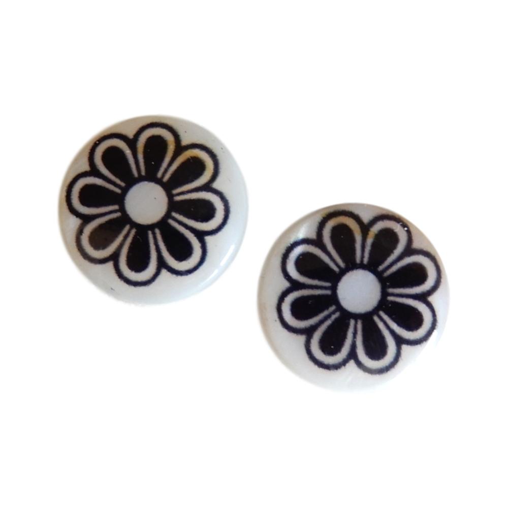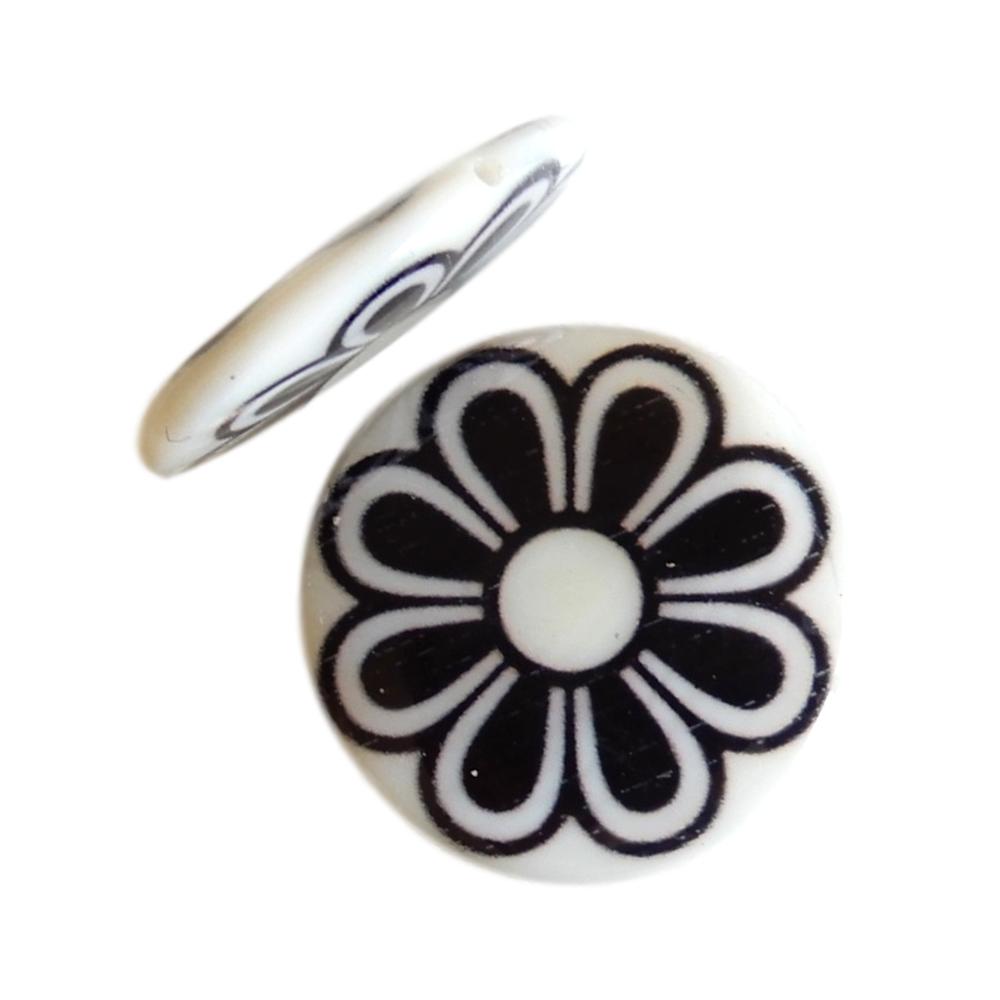 Perle en nacre - Rond plat - 15 mm - Imprimé fleur noire sur fond blanc - 10 pièces