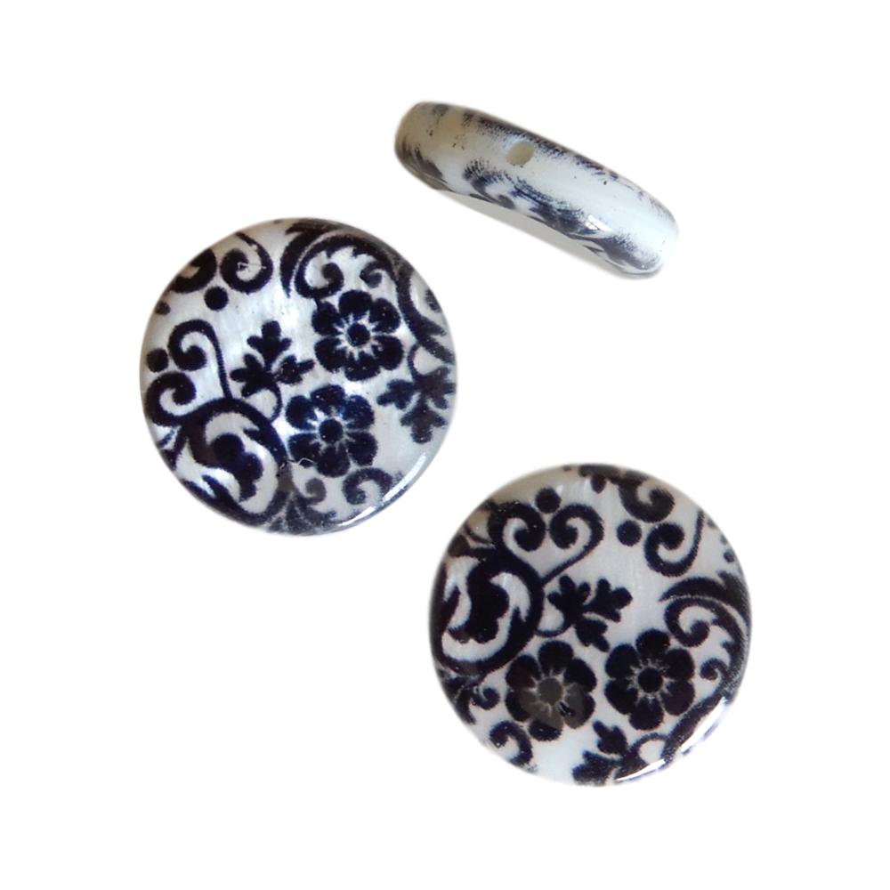 Perle en nacre - Rond plat - 15 mm - Imprimé fleurs baroques noires sur fond blanc - 10 pièces