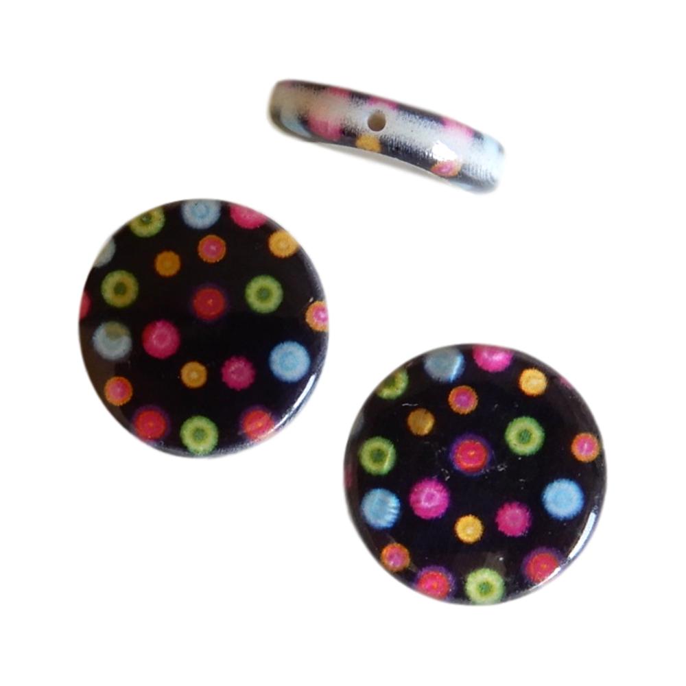 Perle en nacre - Rond plat - 15 mm - Imprimé pois multicolores sur fond noir - 10 pièces