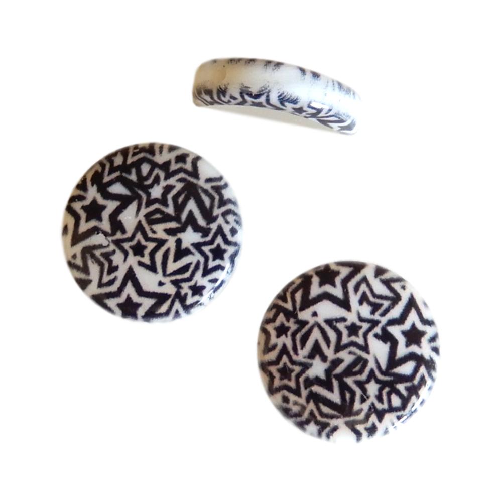 Perle en nacre - Rond plat - 15 mm - Imprimé étoiles noires sur fond blanc - 10 pièces