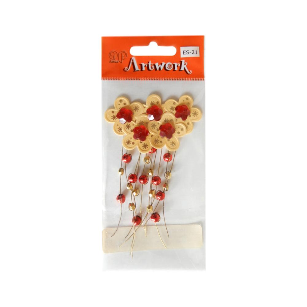 Sticker Art-Work Artoz - Handmade - Fleurs dorées avec strass et perles rouges et dorées - Fleur 2,5 cm - Pq 5 pièces