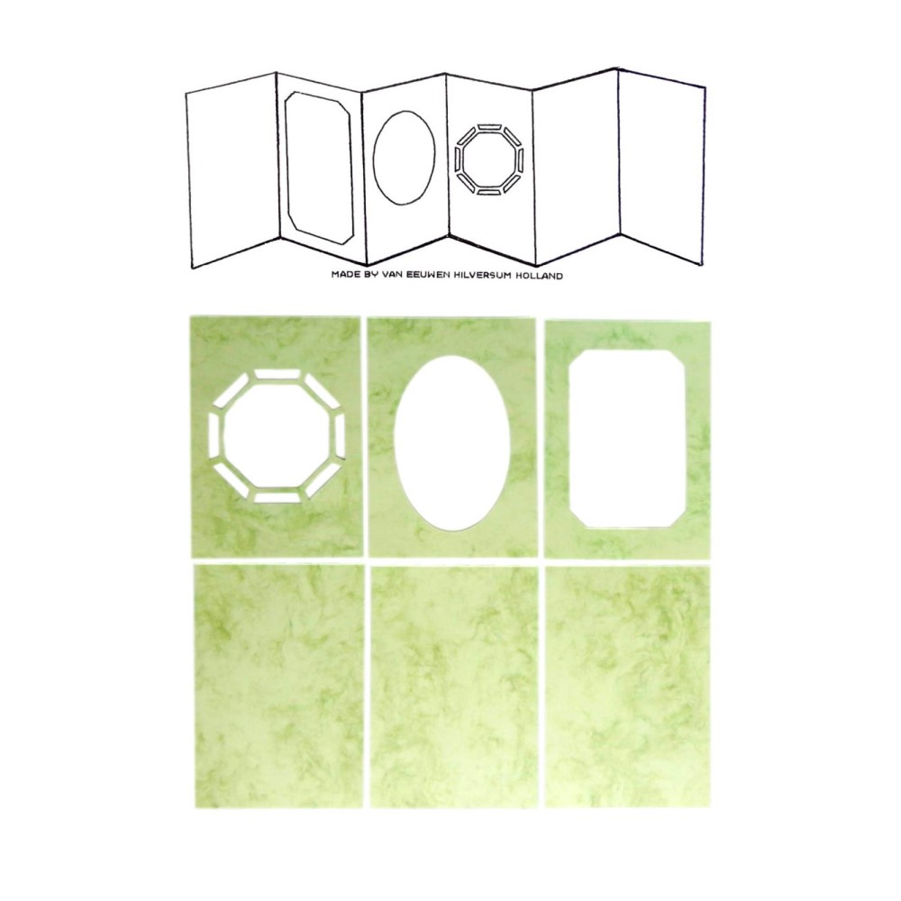 Passepartout + enveloppe blanche - Pliée 14,5 x 10 cm - Dépliée 14,5 x 60 cm - Carte accordéon 6 volets + 6 feuillets (3 pleins + 3 à fenêtre) - Vert marbré - 1 pièce